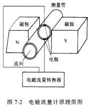 在結構上,電磁流量計由電磁流量傳感器和轉換器兩部分組成,如圖7-1所示。傳感器安裝在工業(yè)過(guò)程管道上,它的作用是將流進(jìn)管道內的液體體積流量值線(xiàn)性地變換成感生電勢信號,并通過(guò)傳輸線(xiàn)將此信號送到轉換器。轉換器安裝在離傳感器不太遠的地方,它將傳感器送來(lái)的流量信號進(jìn)行放大,并轉換成與流量信號成正比的標準電信號輸出,以進(jìn)行顯示,累積和調節控制。