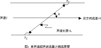 設換能器、與水流方向的夾角為θ,水的流速為且不考慮橫流的影響,聲道長(cháng)度為L(cháng),超聲波在靜水中的聲速為C。當p1發(fā)射超聲波P2接收時(shí),超聲波的順流傳播時(shí)間為: