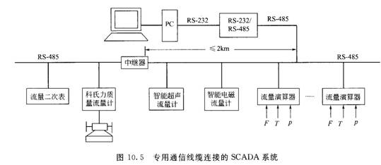 (1)系統的組成圖10.5所示為典型的由專(zhuān)用通信線(xiàn)纜組成的SCADA系統,因中的遠程終端裝置能送入過(guò)程變量流量、溫度、壓力等。AO口可送出4~20mA電流,控制調節閥, DO口可送出無(wú)源接點(diǎn)信號,控制電磁閥、泵等。遠程終端裝置與操作站之間用金屬屏蔽雙絞線(xiàn)連接,具有較強的抗干擾和抗雷擊性能。由于RS-485標準串口通信傳送的距離比RS-232遠,所以遠程終端裝置的通信口標準均為RS-485。由于計算機通信口采用的是RS-232標準,因此計算機同RS-485通信線(xiàn)之間須設置一臺RS-232/RS-485通信轉換器。