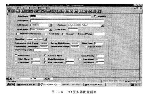I/O Server配置(見(jiàn)圖10.8): Tag Name由用戶(hù)定義, I/O Server:=Modbus, Ad-dress根據情況選擇, Scan Mode=Scan Continuous, Scan Rate = 1, Atgorithm=Analog Input/Output,并根據實(shí)際情況定義最大、最小、上限報警、下限報警等數據值。